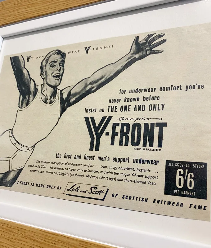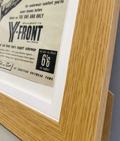 Original 1950’s advertisement print ‘Coopers Y-Fronts’ mounted in a contemporary oak veneer tabletop frame (can also be wall mounted).