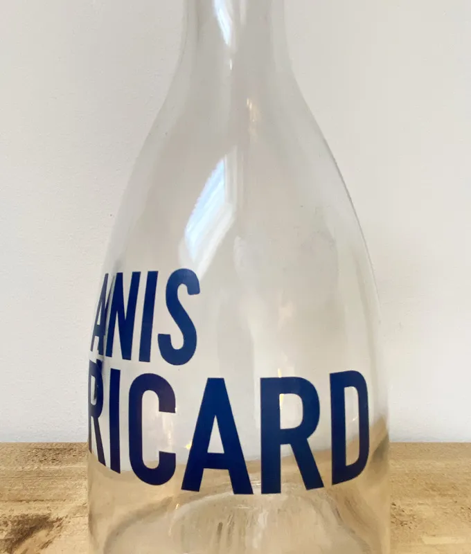Vintage French glass water carafe for aperitifs, featuring dark blue lettering on clear glass. Designed to hold 500 ml and traditionally used with Anis Ricard.